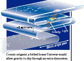 经过深入的研究,阿肯尼-哈米德等提出了“膜世界理论”,认为许许多多空间是以多层膜的形式存在于一个多层超空间。图示为其提出的一个模型。我们人类生存的这个膜(空间)是以折叠的形式存在的,遥远的星球在一个多层空间中看可能离我们地球只有1毫米的距离。光波只能局限在膜内传输,而引力却能够“泄漏”到其它空间,也即引力可以在其它空间传输。由于这个差别,引力在我们这个空间看起来就非常弱了。